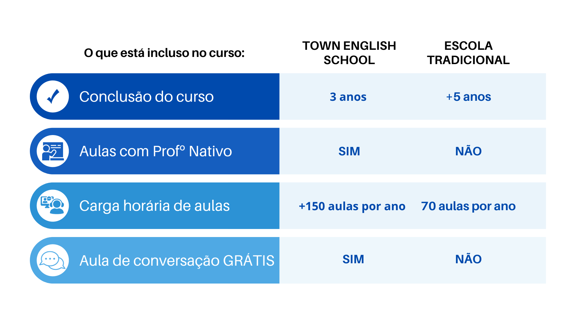 Nas escolas tradicionais você tem uma média de 70 aulas por ano, enquanto na Town English você tem mais de 140 aulas por ano! Ou seja, o nosso ano letivo é maior do que as escolas tradicionais, quase 2x mais aulas no ano, além disso temos aulas de conversação com professores nativos gratuitas que vão acelerar ainda mais o seu aprendizado.